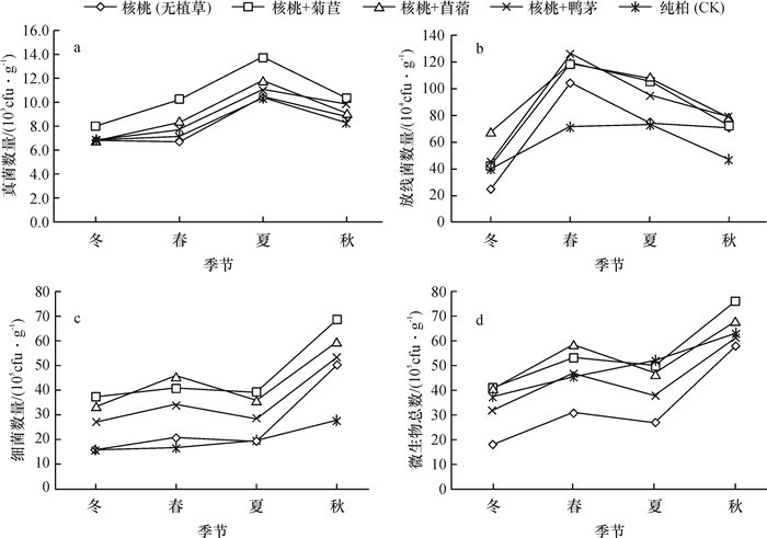 土壤微生物和酶活性是反映土壤肥力最为重要的生物学指标,其产生的变化可以表征土壤熟化程度,对土壤养分转化与循环、有害生物防治、促进土壤良性生态循环及土壤保持具有重大作用[5]。研究不同种植模式下土壤微生物和酶活性的分布状况及季节动态变化,可以直接或间接地反映不同林分对土壤的改良作用。