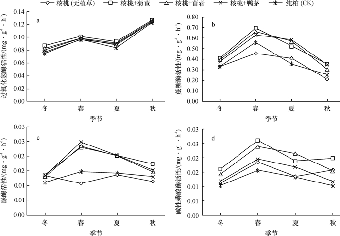 由图 2可知,各模式中土壤脲酶、碱性磷酸酶活性大致以春季最高,其次是夏、秋季,最低为冬季。土壤蔗糖酶表现为春季最高,夏、冬季次之,秋季最低。可能是春季温度开始回升,适宜的温、湿度对土壤酶具有激活效应,而且植物正处于生长旺盛期,根系生长力强,土壤微生物活动较频繁、代谢速率加快,由于土壤酶多数来自微生物的代谢产物及胞内酶,所以该时期的土壤酶活性也相应提高。其中土壤脲酶活性的季节变化与放线菌数量的变化规律一致,说明该酶的季节动态变化受到放线菌数量的变化影响较大。土壤过氧化氢酶活性则为秋季最高,其次是春、夏季,最后为冬季。表明不同土壤酶对温度的敏感程度不同。过氧代氢酶的季节动态可能受到凋落物动态的影响,因为秋季植被逐步枯萎、死亡,大量凋落物进入土壤,土壤微生物活动加强,酶活性随之提高。除了蔗糖酶外的3种酶活性皆以冬季最低,正是因为冬季温度、土壤含水量较低,微生物处于休眠或者死亡状态,间接减弱了土壤酶活性,并且冬季低温干燥也抑制了酶活性。至于蔗糖酶活性低谷期出现在秋季,可能的原因是秋季植物生长处于停滞期,土壤中蔗糖水解速率降低,土壤蔗糖酶活性随之降低。