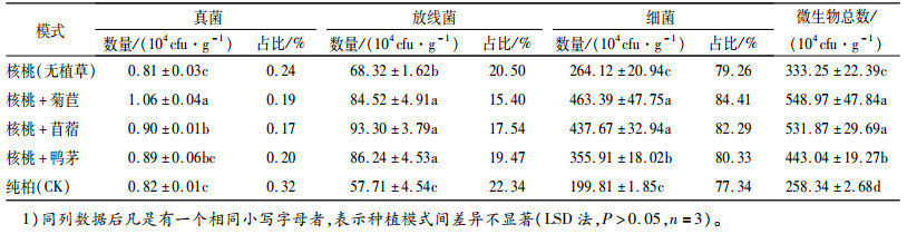 2 结果与分析 2.1 不同种植模式下土壤微生物的组成和数量土壤微生物是土壤生态系统的重要组成部分。细菌在氨化过程中作用重大,真菌积极参与土壤碳素和能源循环过程[8],放线菌发育相对缓慢,其主要通过分解作用将动植物残体转化为土壤有机组分。三者的变化必定影响到土壤中具有生理、生化活性物质的种类和数量[9],因此土壤微生物活性在一定程度上反映了土壤肥力[10]。