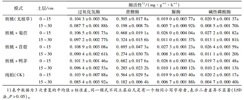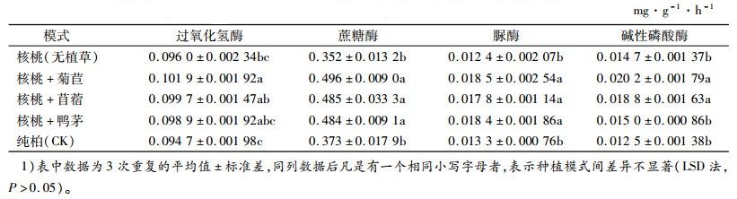 从表 2可以看出,土壤酶活性大小在不同种植模式中表现不同。土壤过氧化氢酶、碱性磷酸酶活性皆表现为核桃+菊苣>核桃+苜蓿>核桃+鸭茅>核桃(无植草)>纯柏;蔗糖酶活性表现为核桃+菊苣>核桃+苜蓿>核桃+鸭茅>纯柏>核桃(无植草);脲酶活性表现为核桃+菊苣>核桃+鸭茅>核桃+苜蓿>纯柏>核桃(无植草)。3种林草复合模式中土壤酶活性与核桃(无植草)、纯柏之间基本上呈显著性差异(P<0.05),但土壤酶活性在不同林草复合模式之间、核桃(无植草)与纯柏之间差异不显著。可见,单纯引进核桃树种对土壤肥力影响不大,而引进核桃并结合种植牧草,不但没有造成牧草与核桃间对土壤营养的竞争,还在一定程度上提高了土壤肥力。其可能是较发达的牧草根系分泌物使微生物大量繁殖,对土壤酶具有刺激作用,影响土壤酶活性的缘故。但根系分泌物以何种成分、通过何种途径来影响土壤酶还有待进一步探究。根系自身也能向土壤提供部分酶[12],必然加大土壤酶活性。同时,不同牧草对土壤质量的影响差异不明显,可能是栽培时间较短、彼此间的差异性暂未表现的缘故。