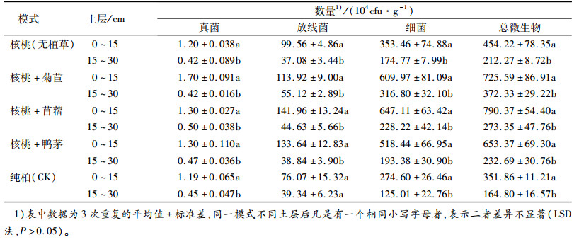 由表 3还可以看出,不同土层之间各模式土壤微生物数量变化幅度不同。放线菌、细菌数量上下层变化幅度最大的皆为核桃+苜蓿,真菌为核桃+菊苣。三大微生物数量上下层变化幅度最小的皆为纯柏。可见引进核桃经济树种以及采用核桃林草复合模式对不同土层微生物数量变化幅度具有一定的影响。树种改变引起土壤原有结构、土壤肥力及其他土壤性质发生相应的改变,不同土层中的土壤微生物种类和数量随之改变。