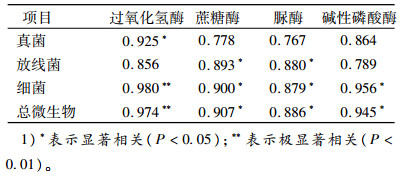 表 5 土壤微生物数量和土壤酶活性的相关性1) Table 5 The correlation coefficient between soil microorganism and soil enzyme activity |