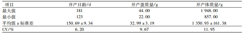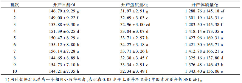 表 2 不同批次如皋黄鸡开产性状平均值和标准差1) Table 2 Means and standard deviations of reproduction traits of Rugao yellow chickens from different batches |