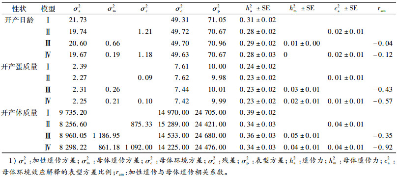 对于开产蛋质量,除去模型Ⅰ之外,模型Ⅱ与模型Ⅲ、Ⅳ之间存在显著差异,表明模型Ⅱ并非适用模型;模型Ⅲ、Ⅳ之间似然比值差异不显著,残差比值以及母体遗传效应相差不大,参数少的模型Ⅲ是开产蛋质量适用模型。