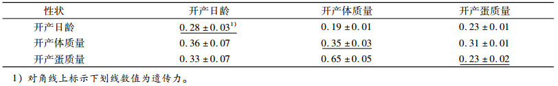 表 4 开产性状之间遗传相关(左下)和表型相关(右上)1) Table 4 Estimated values of genetic (lower left) and phenotypic (upper right) correlations between traits at the first egg |