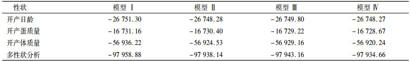如皋黄鸡各动物模型最大似然对数值及模型间χ2检验结果见表 5和表 6。单性状模型Ⅰ、Ⅱ、Ⅲ、Ⅳ参数数量分别为2、3、4、5,多性状模型Ⅰ、Ⅱ、Ⅲ、Ⅳ参数数量分别为12、18、184、24,参数之差为χ2检验自由度。