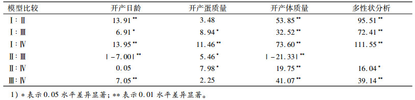 对于开产体质量,模型Ⅱ与Ⅲ互换子模位置,则2个模型之间存在显著差异,模型Ⅱ好于模型Ⅲ;除模型之外,3种模型两两间存在显著差异,所以选择模型Ⅳ为最适模型。