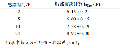 表 1 不同时间点多杀性巴氏杆菌在小鼠肺内的细菌数量1) Table 1 Colony counts of Pasteurella multocida in the lungs of infected mice at different time |