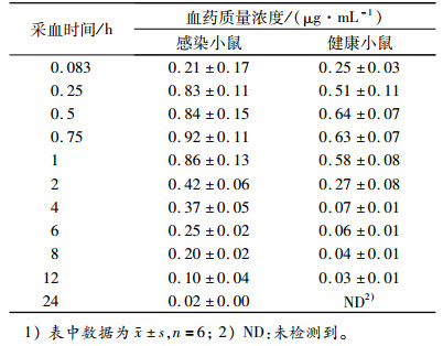 表 2 健康和感染多杀性巴氏杆菌的小鼠单剂量皮下注射2 mg·kg-1马波沙星后的血药浓度1) Table 2 Plasma concentration of marbofloxacin after a single subcutaneous administration (2 mg·kg-1) in healthy mice and in mice with Pasteurella multocida infection |
