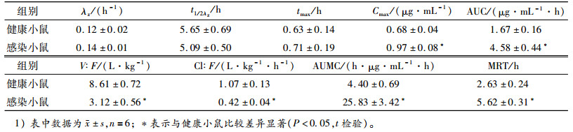 表 3 健康和感染的小鼠皮下注射马波沙星(2 mg·kg-1)的药代动力学参数1) Table 3 Pharmacokinetic parameters of marbofloxacin after a single subcutaneous administration (2 mg·kg-1) in healthy and infected mice |