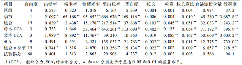 表 1 10个品质性状配合力方差分析1) Table 1 ANOVA for 10 quality traits of tested combinations |