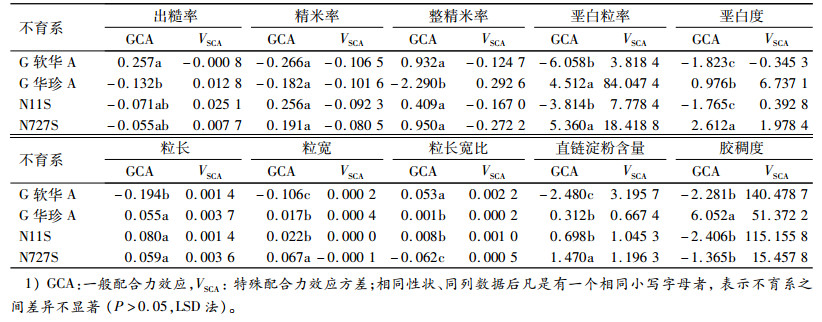 从表 2不育系的分析中得出,出糙率、精米率、整精米率等碾磨品质性状中,出糙率的一般配合力效应表现最好的是G软华A,但其特殊配合力效应方差较低,属于第Ⅱ类亲本,可利用其一般配合力;精米率一般配合力效应差异不显著;整精米率一般配合力表现较好的是N727S和G软华A,这意味着其所配组合的稻米商品率较高,美中不足的是它们的特殊配合力效应方差小,属于第Ⅱ类亲本,主要利用其一般配合力。