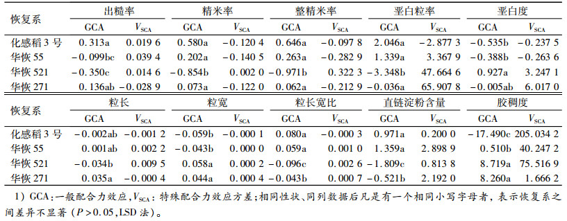 2.3 恢复系的一般配合力效应和特殊配合力效应方差分析从表 3恢复系分析中得出,出糙率、精米率、整精米率等碾磨品质性状的一般配合力正效应最大的是化感稻3号,但是其特殊配合力效应方差在这3个性状中都不大,属于第Ⅱ类亲本,主要利用其一般配合力。碾磨品质最重要性状整精米率的特殊配合力效应方差最大的是华恢521,表明可利用其特殊配合力与特定不育系配出高整精米率的组合。