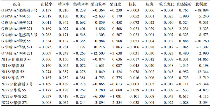 2.4 特殊配合力效应分析表 4中同一亲本的不同组合间和同一组合的不同性状间特殊配合力相差很大,说明基因型互作的多样性。碾磨品质性状中,出糙率表现较好的组合是N727S/华恢521、G华珍A/华恢55;精米率表现较好的组合是N727S/华恢521;整精米率表现较好的组合是G华珍A/华恢521。外观品质性状垩白粒率和垩白度中,G华珍A/华恢271、N11S/华恢521和N727S/华恢521这3个组合的负效应大,表现较好。粒长、粒宽、粒长宽比性状中,粒长正效应较大的组合是N727S/华恢521和N11S/华恢521;粒宽负效应较大的组合是G软华A/华恢271和G华珍A/华恢521;粒长宽比正效应较大的组合是G软华A/华恢271、N11S/华恢521、N727S/华恢521,其中,G软华A/华恢271是因为其粒宽较小导致粒长宽比高,N11S/华恢521和N727S/华恢521是因为其粒长较大导致其粒长宽比高。蒸煮品质性状直链淀粉含量和胶稠度中,直链淀粉含量负效应较大的组合是G软华A/华恢271和N727S/华恢55;胶稠度正效应较大的组合是N11S/化感稻3号和G软华A/华恢521。通过追溯这些高特殊配合力组合亲本的一般配合力发现(表略),各亲本的一般配合力和其所配组合的特殊配合力没有明显的对应关系。