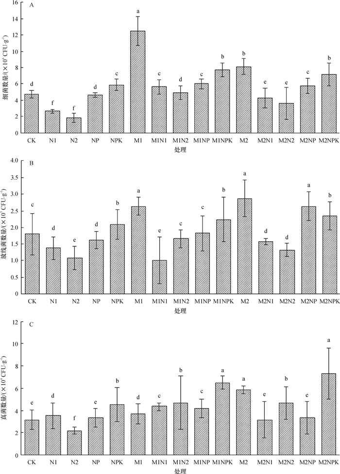 2 结果与分析 2.1 施肥对土壤微生物数量的影响土壤微生物种类和数量变化与土壤的孔隙度、酸碱度、有机质含量等理化性质等有很大关系。本试验发现,测定细菌数量的最适土壤浓度稀释液为10-5,测定放线菌数量的最适土壤浓度稀释液为10-4,测定真菌数量的最适土壤浓度稀释液为10-3。不同模式长期定位施肥处理的土壤中细菌、真菌、放线菌数量的差异见图 1。