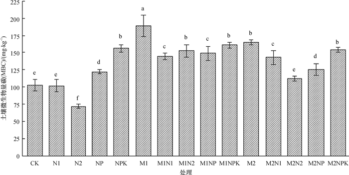 土壤微生物量碳(MBC)是土壤有机质中最活跃和最易变化的部分,是土壤有机碳的灵敏指示因子,也是土壤生物活性的标志。由图 2可以看出,不同施肥条件下,MBC含量差异明显,其大小顺序为:低量有机肥区>高量有机肥区、配施无机肥区>对照、单施无机肥区,除N1、N2、M2N2处理外,其他处理均高于CK处理。CK处理MBC含量为102.37 mg· kg-1;M1处理土壤MBC含量最多,为188.82 mg· kg-1,比CK处理提高了84%;N2处理MBC最少,为72.06 mg· kg-1,比CK处理减少了30%;各处理的土壤MBC平均值为136.87 mg· kg-1。长期单施有机肥M1的MBC含量明显高于其他处理。说明,长期向土壤施常量有机肥,可以提高MBC含量,从而有助于提高土壤肥力。合理配施无机肥(NP、NPK),其MBC含量明显高于单施无机肥(N1、N2)及CK处理,说明合理配施无机肥有利于提高MBC含量。长期单施有机肥(M1、M2),其MBC含量均高于无机肥和有机肥配施,且大部分处于显著水平,可见施用有机肥,在为土壤细菌补充有机碳源的同时,改善了土壤物理性状、刺激了土壤微生物的活性。