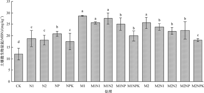 图 3 不同模式长期定位施肥处理土壤微生物量氮(MBN)含量 Figure 3 Microbial biomass N (MBN) of different long-term fertilization patterns 柱子上凡是有一个相同小写字母者,表示处理间差异不显著(P>0.05,Duncan’s法)。 |