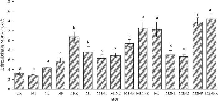 土壤中微生物量磷(MBP)含量较少,但是磷却是生物膜的重要组成之一。由图 4可以看出,MBP含量对环境条件非常敏感,施肥可不同程度地改变其含量。不同施肥条件下,MBP含量大小顺序大体为:高量有机肥区>低量有机肥区、配施无机肥区>对照、单施无机氮肥区。其中,CK处理MBP含量为3.25 mg· kg-1;M2NPK处理MBP含量最多,为14.49 mg· kg-1,比CK处理提高了345%;N1处理MBP含量最少,为2.94 mg· kg-1,比CK处理减少了10%;各处理的土壤MBP平均值为8.29 mg· kg-1。长期单施氮肥(N1)降低了MBP含量,这可能是因为氮肥的施用促进了作物生长,植物生长量增加,吸收了较多的磷,使土壤缺磷更加突出,生物可固定的磷素减少。施磷肥可提高MBP含量,说明施磷肥后土壤有效磷增加,一方面对作物的生长产生了积极的作用,另一方面对土壤生物也产生了直接或间接的影响,使更多的无机磷被同化固持到微生物体内。有机肥及有机无机肥配施对MBP含量增加作用更加显著,高量有机肥比低量有机肥增加更明显。因为有机肥不仅提供了增加微生物量的能量和营养,也促进了土壤通气性,使微生物大量繁殖将部分有机磷和矿化了的无机磷同化为MBP。此外,有机肥本身含有的微生物在施入土壤后会迅速增加,MBP含量也随之增加。有机肥与磷肥配施较单施有机肥土壤MBP含量增加幅度大,且达到了显著水平。可见,施用化学磷肥可一定程度地提高MBP含量,施有机肥是提高土壤微生物对养分固持能力的主要途径。