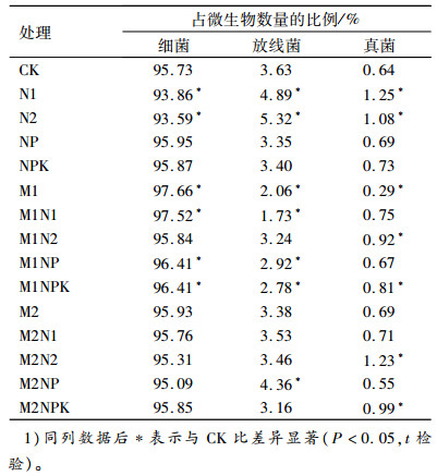 不同施肥条件对土壤各微生物的数量有一定影响,进而影响了各微生物所占的数量比例。由表 2可知,单施低量有机肥(M1)以及大部分无机肥配施低量有机肥(M1N1、M1NP、M1NPK),可增加细菌在土壤微生物数量的比例;单施或配施氮肥可增加真菌在土壤微生物数量的比例;单施和增量施氮肥可明显增加放线菌在土壤微生物数量的比例。真菌型土壤是土壤肥力衰竭的标志,细菌型土壤是土壤肥力提高的生物指标,由此可见,氮肥的施入可明显加速土壤肥力的流失,使土壤由细菌型向真菌型转变;而施用常量有机肥则会使土壤更加肥沃。