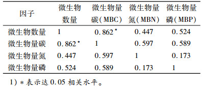 土壤微生物数量与MBC、MBN、MBP之间的相关系数见表 3。由表 3可以看出,MBC含量与土壤微生物数量呈显著正相关。MBC是土壤微生物基本结构的关键元素,所占比例最高,在单个微生物体MBC含量基本固定的情况下,MBC含量的高低直接反映微生物数量的多少。