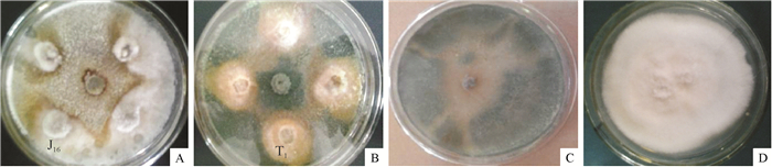 如图 1a所示,在抑菌带的边缘,苹果树腐烂病菌的菌丝体分布不均、明显变薄、颜色变成褐色,菌丝的生长受到明显的抑制,其对照组(图 1c)苹果树腐烂病菌在接种第4天后迅速长满整个平板,J16(图 1a)和T1(图 1b)分别对苹果树腐烂病菌和苹果树炭疽病菌的生长抑制较为明显,抑菌带周围的菌丝体分布不均、颜色变成褐色。