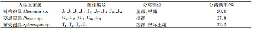 2 结果与分析 2.1 内生真菌的分离和纯化从病区健康苹果树的根、茎及其根际土分离得到真菌共有18株。通过形态学对内生真菌进行初步鉴定,分离得到的内生真菌分属3个属,包括链格孢属Alternaria sp.、茎点霉属Phoma sp.和球壳孢属Sphaeropsis sp.。不同部位真菌的种类和数量也存在差别,其中茎部分离的菌株数最多,为9株,其次是根部5株,根际土4株。其中链格孢属为苹果树茎和根部占绝对优势的内生真菌菌株,占总分离频率的50.0%(表 1)。
