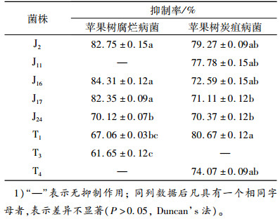 对峙试验结果(表 2)表明,共有8株真菌对苹果树腐烂病菌和苹果树炭疽病菌的生长有抑制作用,占供试菌株总数的44%。其中有5株真菌对苹果树腐烂病菌和炭疽病菌的生长均有抑制作用,另有3株真菌对苹果树腐烂病菌或炭疽病菌的生长分别有不同的抑制作用,不同真菌菌株对苹果树腐烂病菌菌丝生长的抑制率有一定差异,其中抑制率在80%以上的有J2、J16、J17 ,对苹果树腐烂病菌的生长抑制率分别达82.75%、84.31%、82.35%。除J11和T4无抑制作用外,剩余的菌株对苹果树腐烂病菌生长的抑制率集中于60%~70%;T1内生真菌对苹果树炭疽病菌的抑制率最高,达80.67%,除T3菌株无抑制作用外,其他6株内生真菌对苹果树炭疽病菌的抑制率均大于70%。