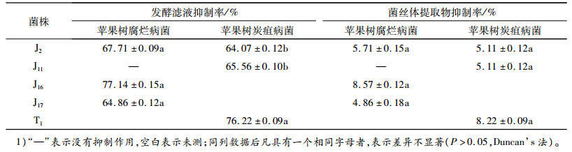 由表 3可知,不同拮抗真菌发酵后的滤液对苹果树腐烂病菌和炭疽病菌菌丝生长的抑制作用差别较大,对苹果树腐烂病菌的抑制率最大为77.14%,对苹果树炭疽病菌的抑制率最大为76.22%,其他菌株的抑制率都大于60%。菌丝提取物对病原菌菌丝的生长抑制作用不显著,其中对病原菌生长有较强抑制作用的拮抗真菌J16和T1,最大抑制率均小于9%。