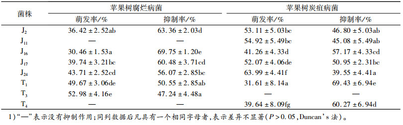 内生真菌发酵液对苹果树腐烂病和苹果树炭疽病分生孢子萌发有抑制作用,且不同菌株的发酵液对分生孢子萌发的抑制作用有较大差异。从表 4中可以看出,除J11和T4外,所测的菌株对苹果树腐烂病菌孢子萌发的抑制率均大于45%,其中对苹果树腐烂病菌分生孢子萌发抑制作用最强的为J16,抑制率为69.75%;除T3外,其他菌株对苹果树炭疽病菌分生孢子萌发抑制率均不小于39.55%,其中作用最强的为T1,抑制率为69.43%,但内生真菌的发酵液对2种病原菌孢子萌发抑制率均小于70%,分析可能是发酵液中的活性物质浓度不足。