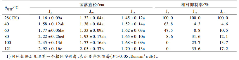 1.2.5 发酵液的热稳定性J2、J11、J16、J17、T1发酵液经过无菌滤纸和0.22 μm微孔滤膜过滤,在无菌条件下取15 mL于灭菌试管中,经过20(CK)、40、60、80、100 ℃水浴加热和121 ℃高温灭菌处理30 min[19],冷却到室温,在超净工作台中,取处理过的发酵液加入100 mL的已灭菌并且温度降至50 ℃以下的PDA培养基中,充分混匀后,在灭菌平板中倒入约15 mL,待培养基凝固后,采用平板打孔法,在相应的固体培养基中央接入4 mm的苹果树腐烂病菌饼、苹果树炭疽病菌饼,以28 ℃发酵液作为对照,每个处理重复3次,28 ℃恒温培养48 h,用十字交叉法测量苹果树腐烂病菌和苹果树炭疽病菌的直径,计算抑制率。