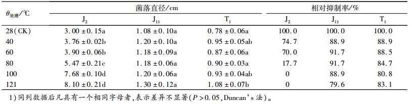 表 6 苹果树炭疽病菌拮抗真菌J2, J11和T1发酵滤液的热稳定性1) Table 6 Heat stability of zymotic fluid of antagonistic fungi J2, J11 and T1 against Glomeralla cingulata |