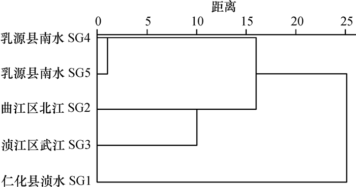 聚类分析结果(图 1)也表明,除单优群落外,地理位置相近的植物群落的物种相似性较高,如乳源南水水域的2个样点(SG4和SG5)物种相似性较高,优先聚在一起;曲江区大坑口(SG2)与武江水域(SG3)的沉水植物群落相似性也较高,它们先聚在一起;浈江区水域(SG1)物种最贫乏,最后才与其他样点聚在一起。