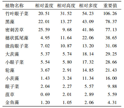 2.2 重要值和物种多样性重要值(Ⅳ)=相对高度+相对盖度+相对频度。其中:相对高度=(某一物种高度/全部物种高度)×100%,相对盖度=(某个物种的盖度/所有物种的总盖度)×100%,相对频度=(某一物种的频度/所有物种的频度之和)×100%。