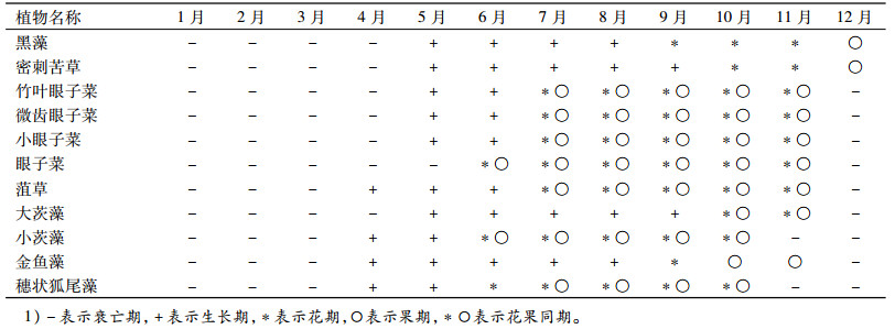 实地调查发现,北江流域的沉水植物均为1年生草本植物,冬季至早春为衰亡期,花期或果期在夏季至秋季,眼子菜科植物和穗状狐尾藻通常是花果同期,多集中在7—11月(表 4)。