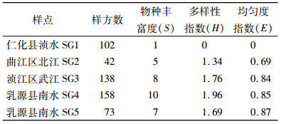 物种多样性分析结果(表 5)表明,北江流域调查样点的沉水植物,除仁化县浈水水域SG1仅1物种外,其余4水域物种丰富度为5~10,多样性指数为1.34~1.96,均匀度指数为0.69~0.87,以韶关南水水域SG4和SG5的沉水植物群落的物种最丰富,物种多样性也高,浈水水域的物种丰富度和多样性最低。