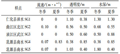 5个调查区的水草区和非水草区的水质特性调查结果(表 6~表 8)表明,除了SG4水域为人工硬质护岸,水流较快外,其余水域均为自然的土质护岩,水草生境的水流较慢。水草通常生长在水位小于1.1 m、水流较缓、可透光的区域。除SG1外,冬季和夏季的水位稍有变化:SG4和SG5以夏季水位较高, SG2和SG5的水位冬季较高(表 6)。
