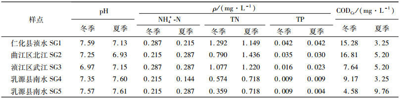 不同水样的pH、总氮(TN)、总磷(TP)、铵氮(NH4+-N)含量和化学需氧量(CODCr)见表 7。不同调查点的水质有所不同,同一调查点夏季与冬季的水质也有不同程度的变化。各调查点水样呈中性,pH 6.93~7.61,以大坑口样点SG2的pH最低,南水水域的pH稍高,不同季节间的变化趋势不明显。变化较大的指标为TN、TP、NH4+-N含量和CODCr。整体来看,南水2个调查点SG4和SG5的水质最好,除总氮和铵氮外,其余指标均达到或接近国家Ⅰ级地表水的质量水平(国家地表水环境标准GB3828-2002);其余调查点水质的总氮和化学需氧量处于国家地表水Ⅱ~Ⅲ级之间。从同一水域不同季节的变化情况来看,TP、NH4+-N含量和CODCr以冬季较高,TN则以夏季稍高。