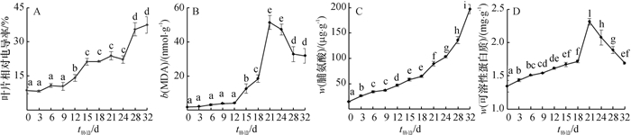 2.3 干旱胁迫对圆叶乌桕叶片渗透调节物质含量的影响如图 1C所示,圆叶乌桕叶片脯氨酸含量随着干旱胁迫程度的加剧呈持续上升的趋势。其中,在干旱第0天脯氨酸质量分数为14.72 μg·g-1,在轻度干旱与中度干旱时期(6~20 d)上升缓慢(P<0.05),在重度干旱时期(21~32 d)急剧上升(P<0.05),第32天比第0天的叶片脯氨酸含量增加了12.4倍。由此说明,随着干旱胁迫的发展,尤其在干旱胁迫的后期,圆叶乌桕幼苗叶片脯氨酸积累现象越来越明显。