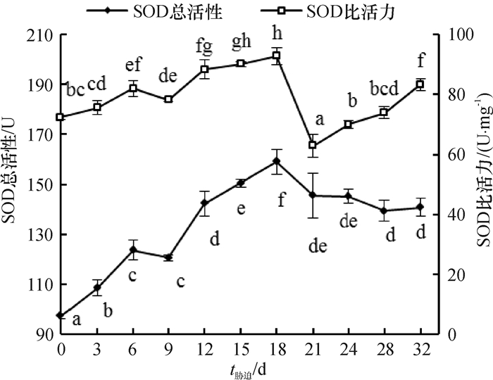2.4 干旱胁迫对SOD活性的影响随着干旱胁迫的发生,叶片SOD比活力呈现先上升后下降再上升的变化(图 2),干旱第0天为72.35 U·mg-1,干旱第18天时达到峰值,为92.77 U·mg-1,干旱第21天达到最低值后显著上升;叶片SOD活性在第0天为97.22 U,随着干旱时间的持续而逐步增加(图 2),在第18天达到峰值159.19 U,比第0天活性增加63.7%,随后,SOD活性显著下降(P<0.05),并维持在较高的水平。
