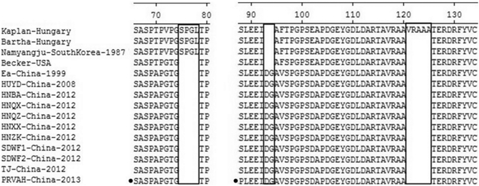 在PRV gB糖蛋白N端的59~126氨基酸序列存在3个连续的抗原表位区,这一区域的氨基酸序列具有高柔韧性、易接近性和亲水性,具有抗体结合位点(ABD)的特征[8]。在本研究中,与Bartha株相比,所有国内毒株均存在4个氨基酸的缺失(75~78氨基酸)和2个氨基酸的插入(93~94氨基酸),这些突变都在59~126氨基酸区域,可能会影响抗原-抗体的结合。