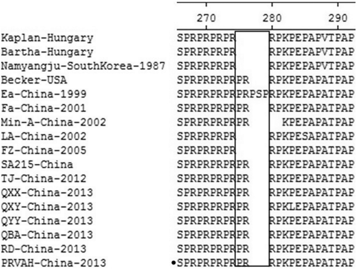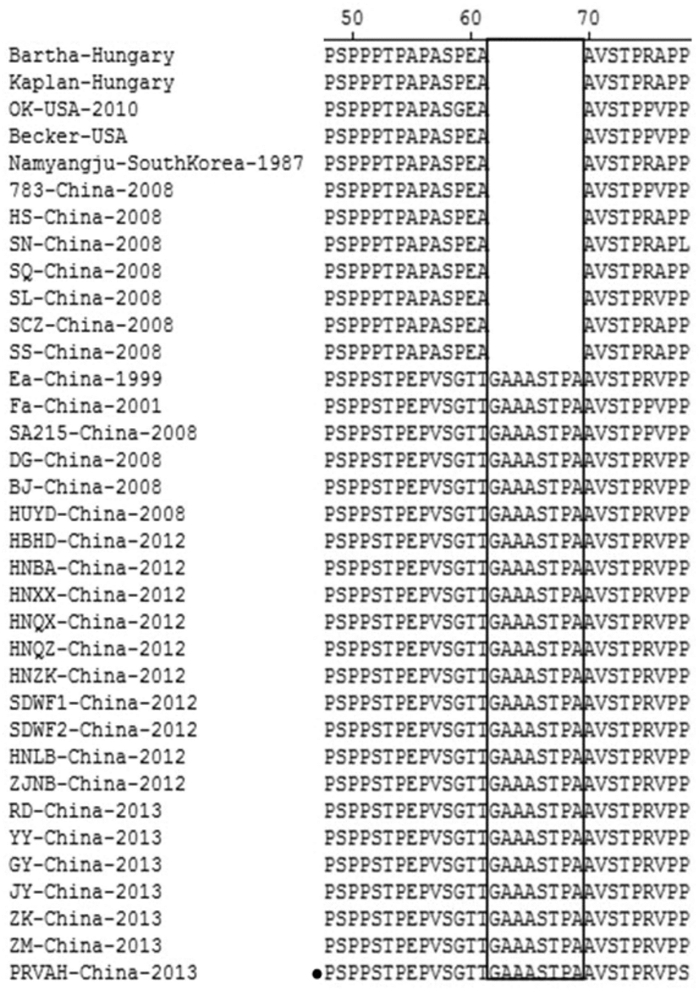 PRV gD糖蛋白可介导细胞间的融合,主要通过与细胞表面被称为疱疹病毒侵入介质(Herpesvirus entry mediators, Hve)的受体发生结合,以稳定病毒与细胞的相互作用。gD糖蛋白也是诱导产生中和抗体的靶蛋白之一,这种抗体可减少PRV侵入细胞,从而在抗病毒免疫中发挥重要作用[10]。在本研究中,与Bartha株相比,国内PRV新毒株的gD氨基酸序列在267~276氨基酸处存在(Pro-Arg)5 序列,而在Bartha株是(Pro-Arg)4序列,且在这一区域脯氨酸的连续间隔排列可以在蛋白表面形成严格的亲水结构,从而有利于蛋白之间的相互作用[11]。这些特殊氨基酸序列在PRV感染中的具体作用尚不清楚。国内毒株在gD蛋白中的这些突变是否会影响其与Bartha株疫苗抗体的有效结合尚需进一步证实。