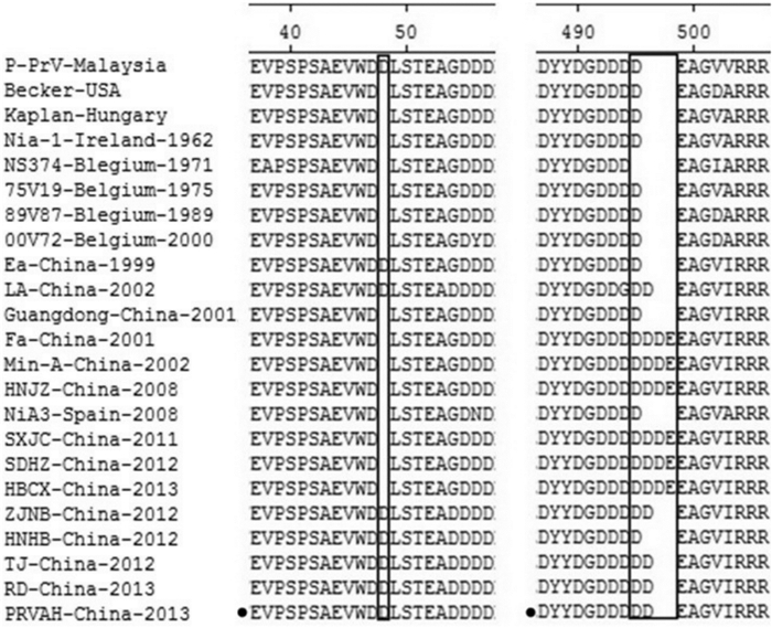 PRV gE糖蛋白在介导细胞融合、病毒扩散和释放等方面起着重要作用[12-13],同时gE基因也与PRV的毒力相关[14-15]。在本研究中,国内毒株gE氨基酸序列的主要区别在于48位和496~498位存在不同数量氨基酸的插入,这些插入可能会导致病毒毒力的改变。