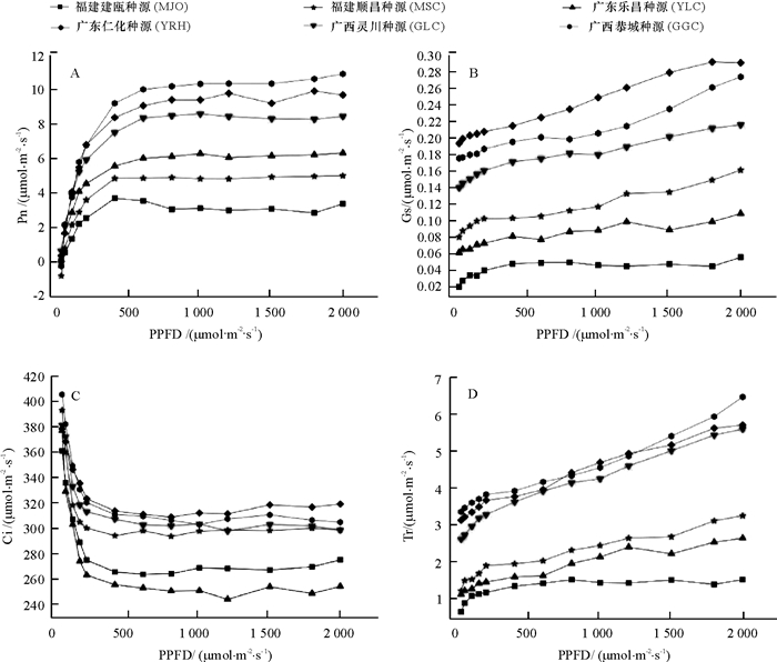 3 讨论与结论净光合速率的光响应曲线反映光合速率随光强改变的变化规律[15]。本研究结果表明, 参试的6个不同种源刨花润楠光合作用光响应曲线呈现出相似的变化趋势, 即净光合速率随着光量子通量密度(PPFD)的增强而增大, 符合光合速率随光强改变的变化规律; 但6个不同种源刨花润楠最大净光合速率的变化幅度为5.32~12.20 μmol·m-2·s-1, 整体表现光合速率偏低, 不同种源光合速率高低排序依次为广西恭城、广东仁化、广西灵川、广东乐昌、福建顺昌、福建建瓯, 初步反映广西恭城种源刨花润楠的生物质生产力较突出。