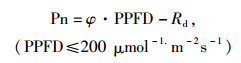 将小于200 μmol-1.m-2.s-1的PPFD与Pn进行直线回归, 可按下式计算出光补偿点、光饱合点和φ等参数[13]: