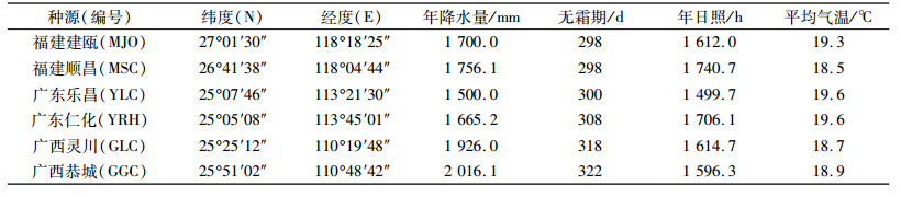 1 材料与方法 1.1 试验材料和试验地选取位于树冠中部外层、叶龄相近的功能叶片进行测量。试验选取6个不同种源的刨花润楠种子培育的1年生苗木, 其分别为福建建瓯种源(MJO)、福建顺昌种源(MSC)、广东乐昌种源(YLC)、广东仁化种源(YRH)、广西灵川种源(GLC)、广西恭城种源(GGC), 各种源采种地的地理位置与气候因子见表 1。试验地点位于广州市华南农业大学林学院教学科研基地, 地理位置E 113°37′, N 23°16′, 海拔42.3 m, 属于南亚热带季风气候区, 平均气温21.9 ℃, 最冷月平均气温11.0 ℃, 最热月平均气温28.7 ℃, 最低气温为-2.6 ℃, 最高气温为39.3 ℃。平均年降水量1 696.5 mm, 年降水150 d左右, 降雨多集中于4—6月份。年平均相对湿度68%, 平均霜期每年1 d, 年平均日照1 800 h。