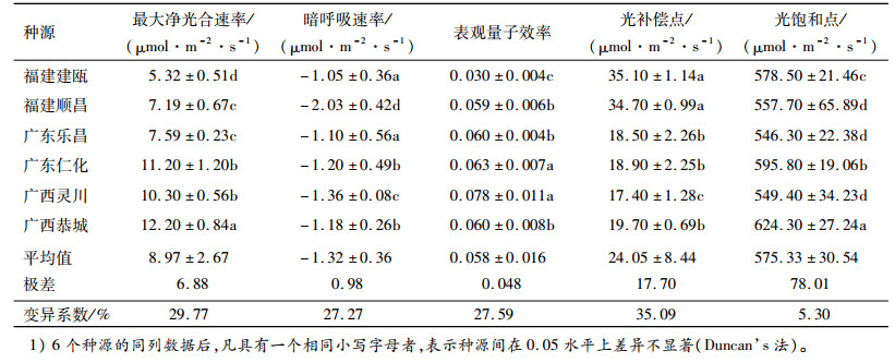 在植物光合作用中, 最大净光合速率愈大, 表明植物利用光能的潜在能力愈强[14]。由表 2可以看出, 6个刨花润楠不同种源间最大净光合速率的变化幅度为5.32~12.20 μmol·m-2·s-1, 极差为6.88 μmol·m-2·s-1, 变异系数为29.77 %。各种源最大净光合速率从大到小依次为广西恭城、广东仁化、广西灵川、广东乐昌、福建顺昌、福建建瓯。福建2个种源的最大净光合速率显著低于另外4个种源。从总体上看, 光合作用潜在能力大小依次为广西种源、广东种源、福建种源。