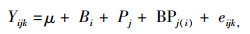 式中,Yijk为i区组j种源中的k单株某性状的测量值;μ为试验平均值;Bi为i区组的效应值;Pj为j种源效应值;BPj(i)为i区组与j种源的交互效应值;eijk为残差效应值[10]。