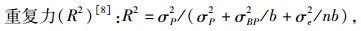 式中:R2为种源某性状的重复力,σP2为某性状种源的方差分量,σBP2为区组与种源的互作方差分量,σe2为误差项方差分量,n为小区内株数,b为区组数。
