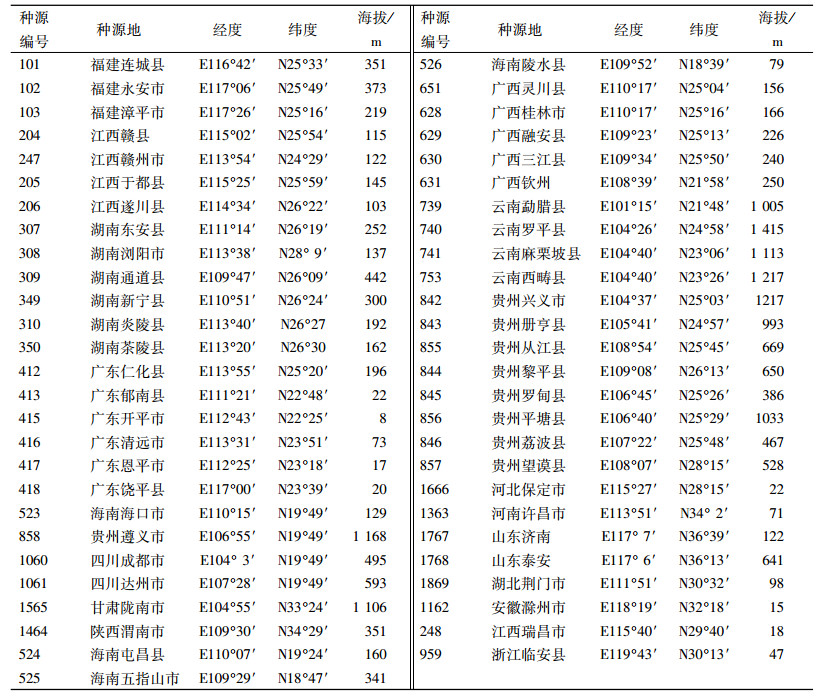 1.3.4 环境因子数据获取气象数据取自各采种点或相近气象台站点在中国气象数据网中国气象资料年值数据集,1951—2012年的气象数据均值。地理因子为采种点GPS记录数据。
