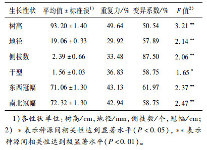 由表 2还可知,树高、东西冠幅和南北冠幅等性状的重复力较高,均达到40%以上,说明这些性状较另外3个性状在种源间的差异更为稳定,而地径重复力仅为29.92%,表明地径在种源间表现的差异稳定性较弱。